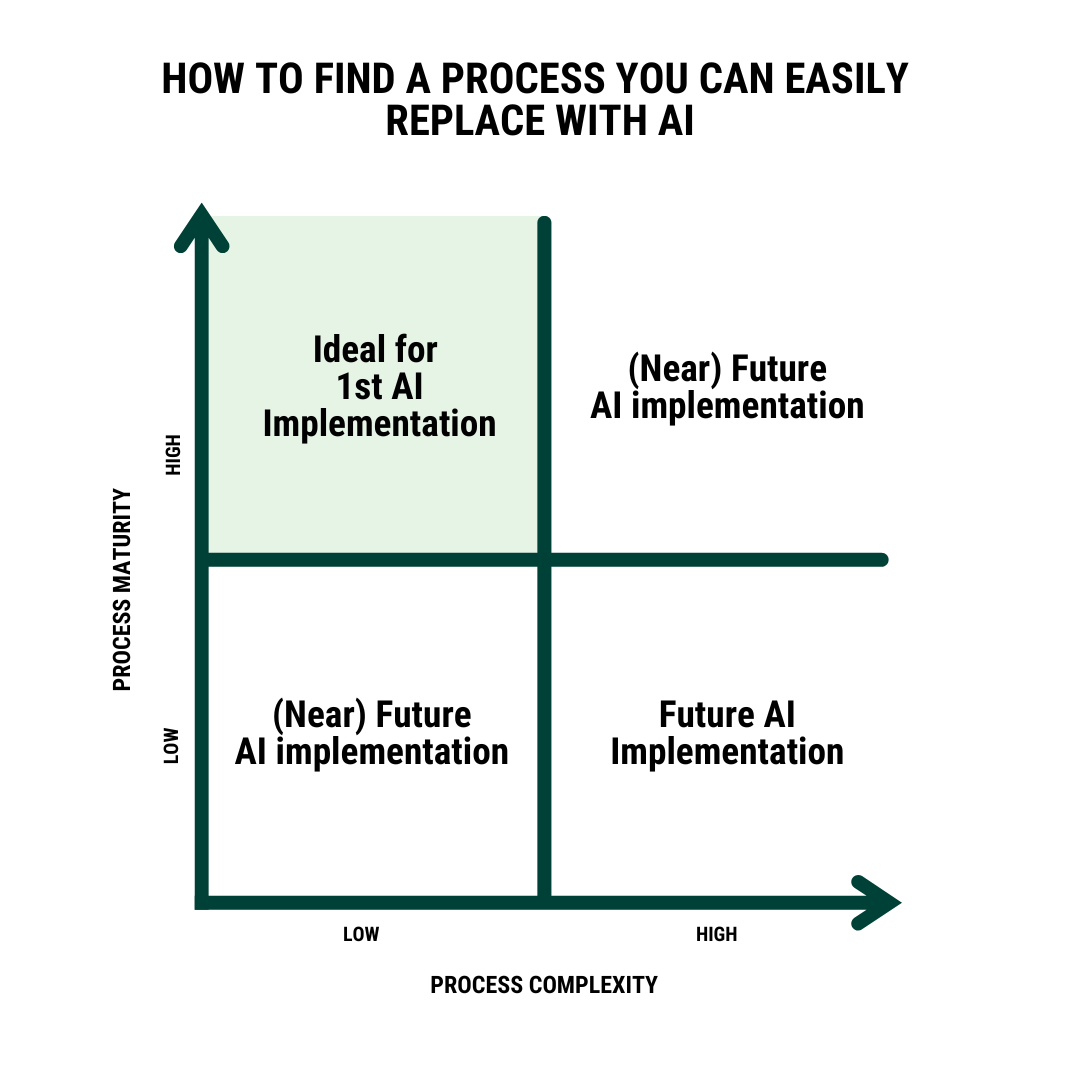 For your first AI implementation, focus on the upper-left quadrant: mature processes with low complexity. These provide the right balance of being well-understood within your organization with clear benchmarks.