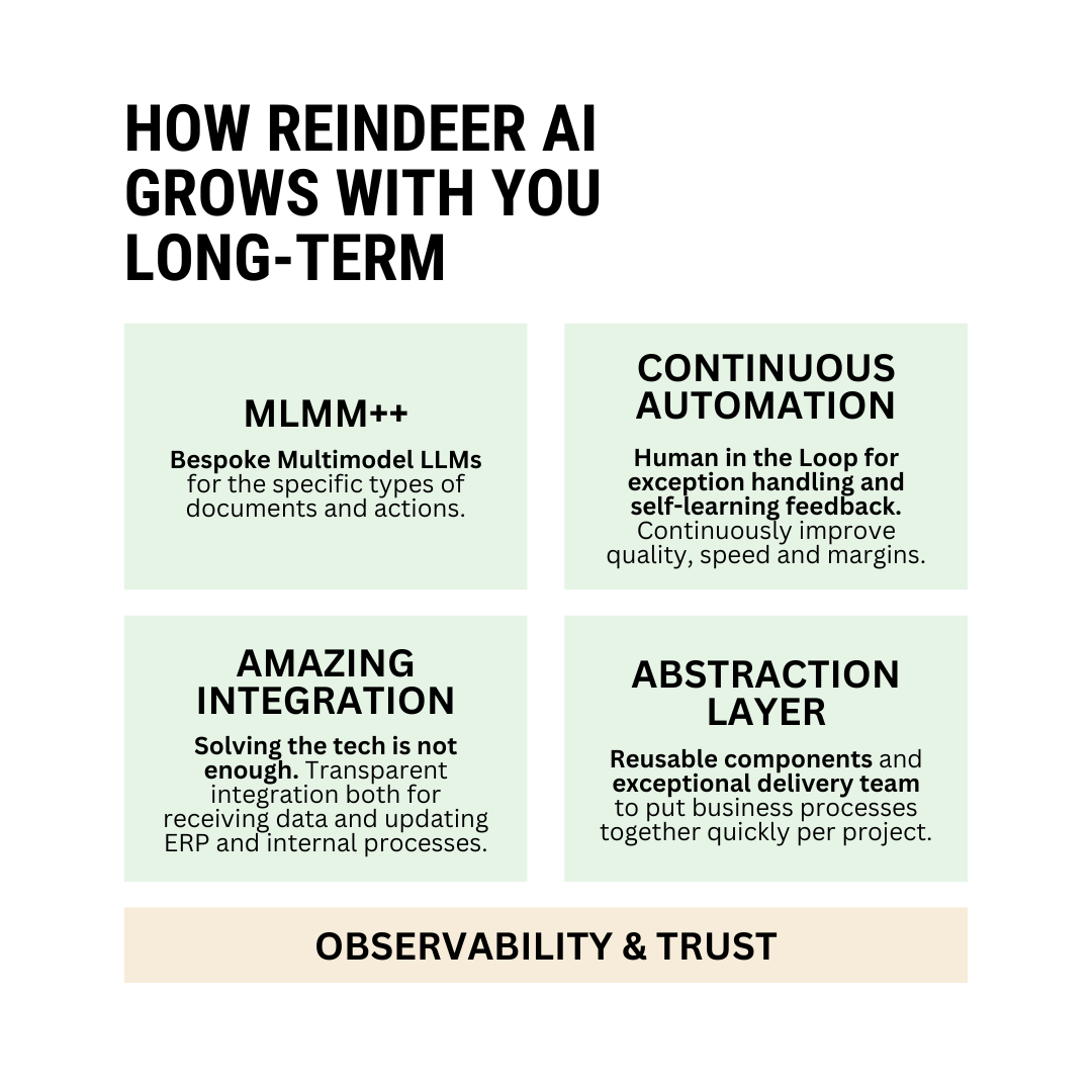 Reindeer AI was built as a horizontal platform to scale with your business. We provide custom-built AI solutions for logistics and operations teams and eliminate the need to outsource processing things like invoices, BOLs, customs forms, and whatever else lands on your desk.